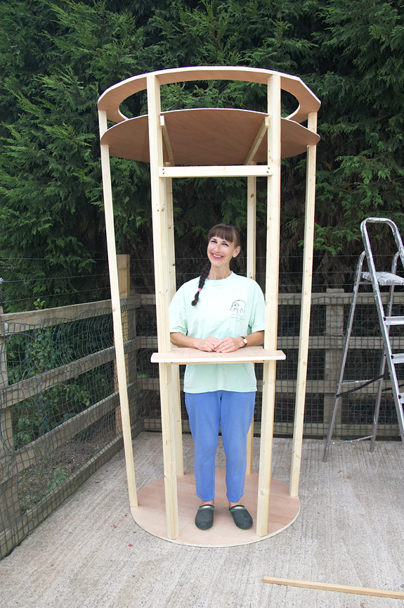 Greg is inside his creation, the framework of a large ice cream cone.