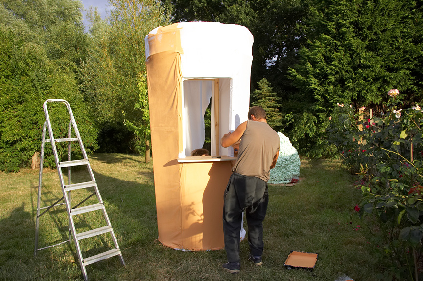 We were invited to have a booth at the "It's Me Or The Dog" section of the 2006 Wag & Bone Show in Windsor. We thought about creating an ice cream parlour, and, in the end, decided on a large ice cream cone. The ice cream (foam) is in the background, while Zbig and Greg fix the "skin" on our cone.
